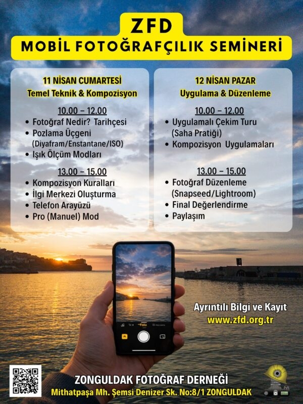 ZFD Mobil Fotoğrafçılık Semineri 11-12 Nisan 2026 tarihinde düzenlenecektir. AYRINTILI BİLGİ ve ON-LINE KAYIT İÇİN TIKLAYINIZ