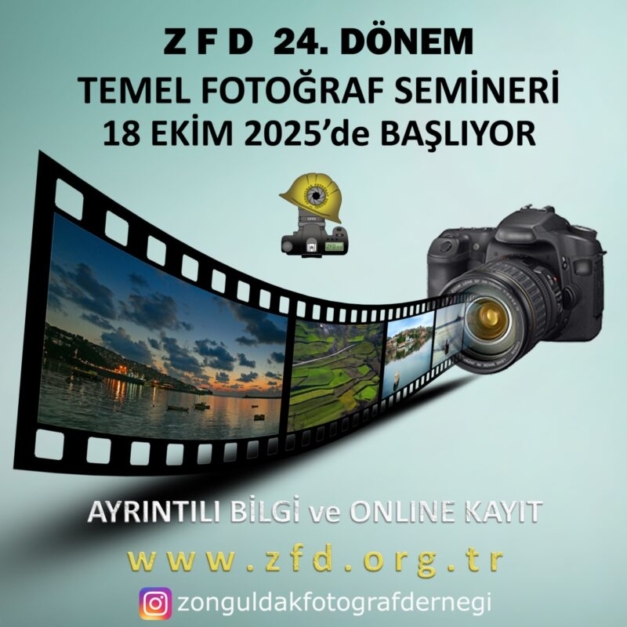 Zonguldak Fotoğraf Derneği 24. Dönem Temel Fotoğraf Semineri 18 Ekim 2025 tarihinde başlıyor. AYRINTILI BİLGİ VE KAYIT OLMAK İÇİN TIKLAYINIZ Seminer Programı için tıklayınız.